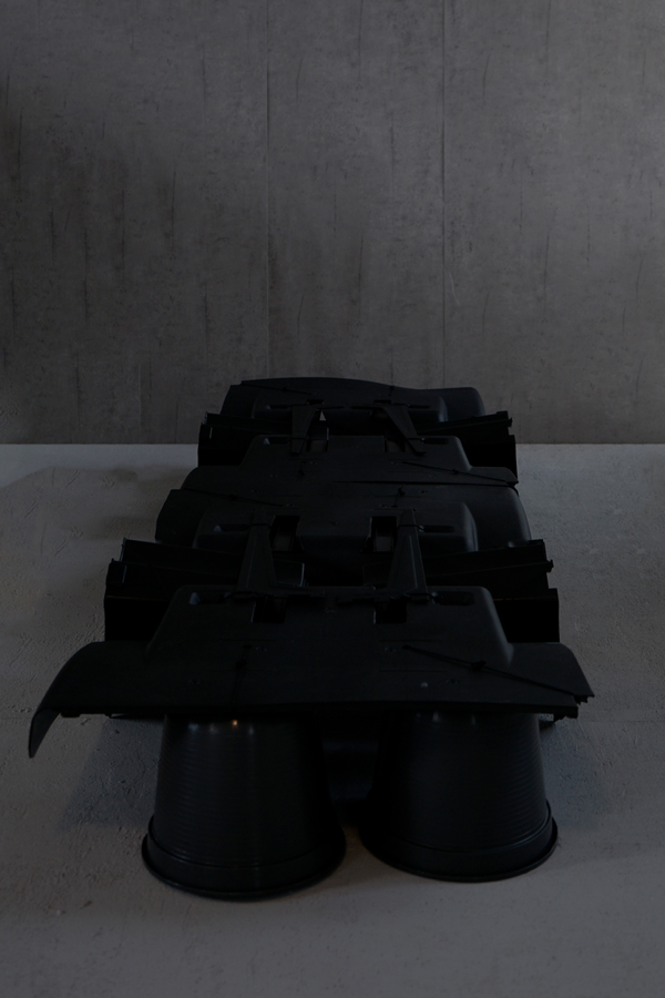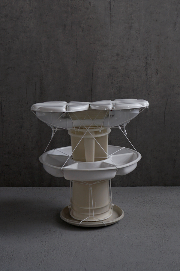 Preparing for that world, survivalists, aiming to supplement essences of a capitalist system and ensuring the survival of the concept of consumption, need to rethink the way products are made, following the dogma “form follows fluid function”; by deliberately ignoring the initial function and meaning of objects, they can be unlocked as raw material and shape without preconfigure connotations, transforming them into modules. When the parts that make an object are objects themselves, a function larger than the sum of its parts can emerge and disappear as needed. These monochromatic chimeric assemblages are held together by roping techniques (a modified jam-knot), enabling disassembly and the modules to return to their initial function or to be reused and interchanged between sets.